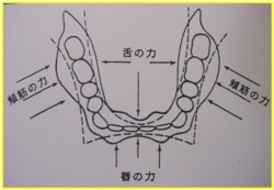 すなわち歯列は外側から口腔周囲の筋肉の力にたいし内側からは舌の圧力が相拮抗してバランスが保たれます。たとえ歯を失っていてもこの均衡状態は変わらず、側方からは頬筋、前方からは唇が内側に押しています。それに対し舌は外側への支えを失い、もと歯のあった方向へ広がっていきます。