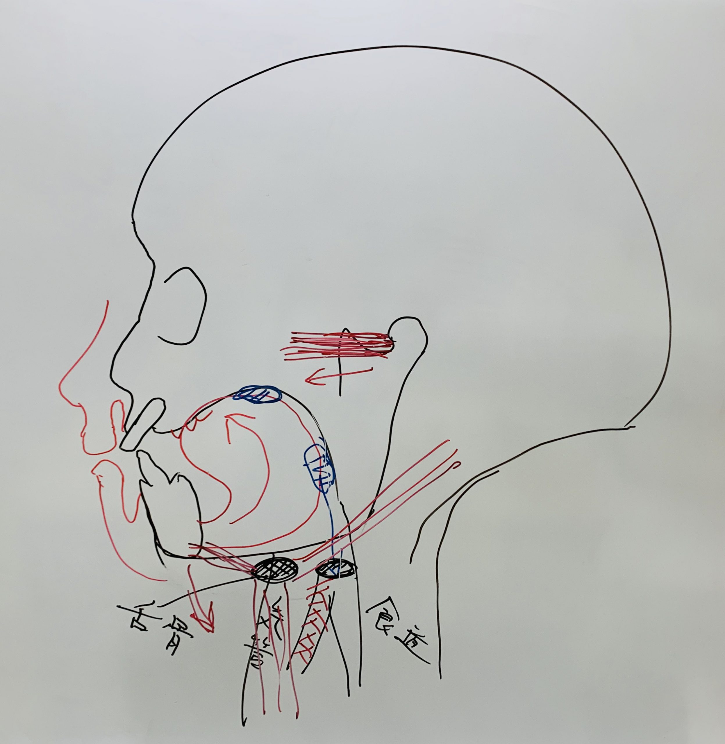舌の起始は下顎舌側の棘突起のところに付着しています。人体には206個の骨がありますが、骨格を構成している骨には起始、停止があります。舌は起始が下顎舌側についており停止がありません。